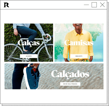 Estruturamos uma home fluida e investimos na diagramação e no equilíbrio visual entre as cores, trabalhando consistência e contraste, em alinhamento com o brandbook da Reserva. Tudo dentro de um contexto de layout flexível, em que um mosaico possibilita a alteração do design do site, por meio do uso de banners para destacar coleções, categorias ou mix de produtos, conforme a necessidade.