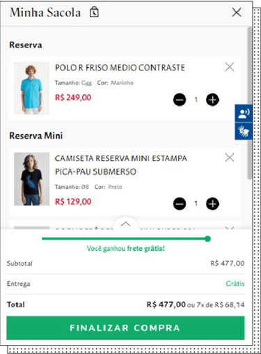 Também criamos uma gamificação ligada à política de descontos. Quando o usuário adiciona produtos ao carrinho, é informado sobre quanto falta para ter frete grátis — o que, estrategicamente, aumenta o ticket médio da Reserva.