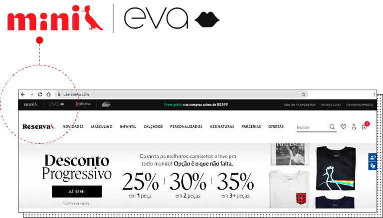 Como a ideia seria favorecer que a experiência do usuário acontecesse no mesmo domínio, Reserva, Mini e Eva ganharam layouts diferentes e se tornaram multi checkout. Assim, é possível, por exemplo, que um cliente chegue ao site querendo uma camiseta da Reserva para ele mesmo e decida também adquirir roupas, calçados e acessórios para todos da família, numa compra única, integrando todo o catálogo de produtos das três marcas.